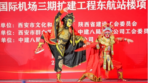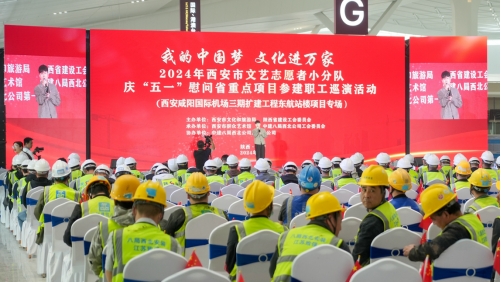 4月19日,2024年西安市文艺志愿者小分队庆“五一”慰问省重点项目参建职工巡演活动(西安咸阳国际机场三期扩建工程东航站楼项目专场)在中建八局西安咸阳国际机场项目举办。陕西省建设工会文艺轻骑兵为现场的数百名工友带来了精彩的文艺节目。