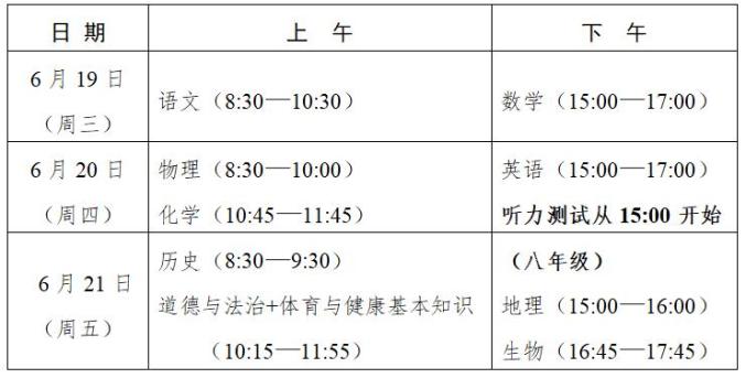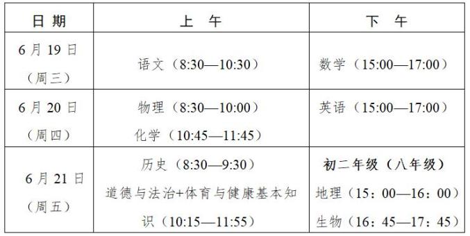 答:2024年中考省级统一考试安排在6月19日—21日举行,具体科目考试时间安排如下: