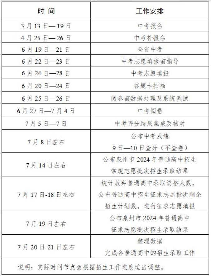 (二)泉州市、县(市、区)中招管理部门协同组织管理全市普通高中招生录取工作。按照普通高中招生省级统筹、地市主体、县级落实责任,泉州市教育局负责全市高中阶段学校的招生录取工作,稳妥做好统一切线组织工作。全市普通高中招生常规志愿批次录取结果公布时间7月14日左右,征求志愿批次录取结果公布时间7月19日左右,具体日程安排见《2024年泉州市中考中招工作时间安排表》(见附件7)。