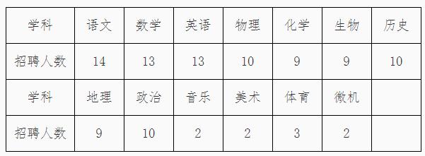 共招聘教师13名,其中语文1名、数学1名、英语1名、物理1名、化学1名、生物2名、历史2名、地理2名、政治2名。