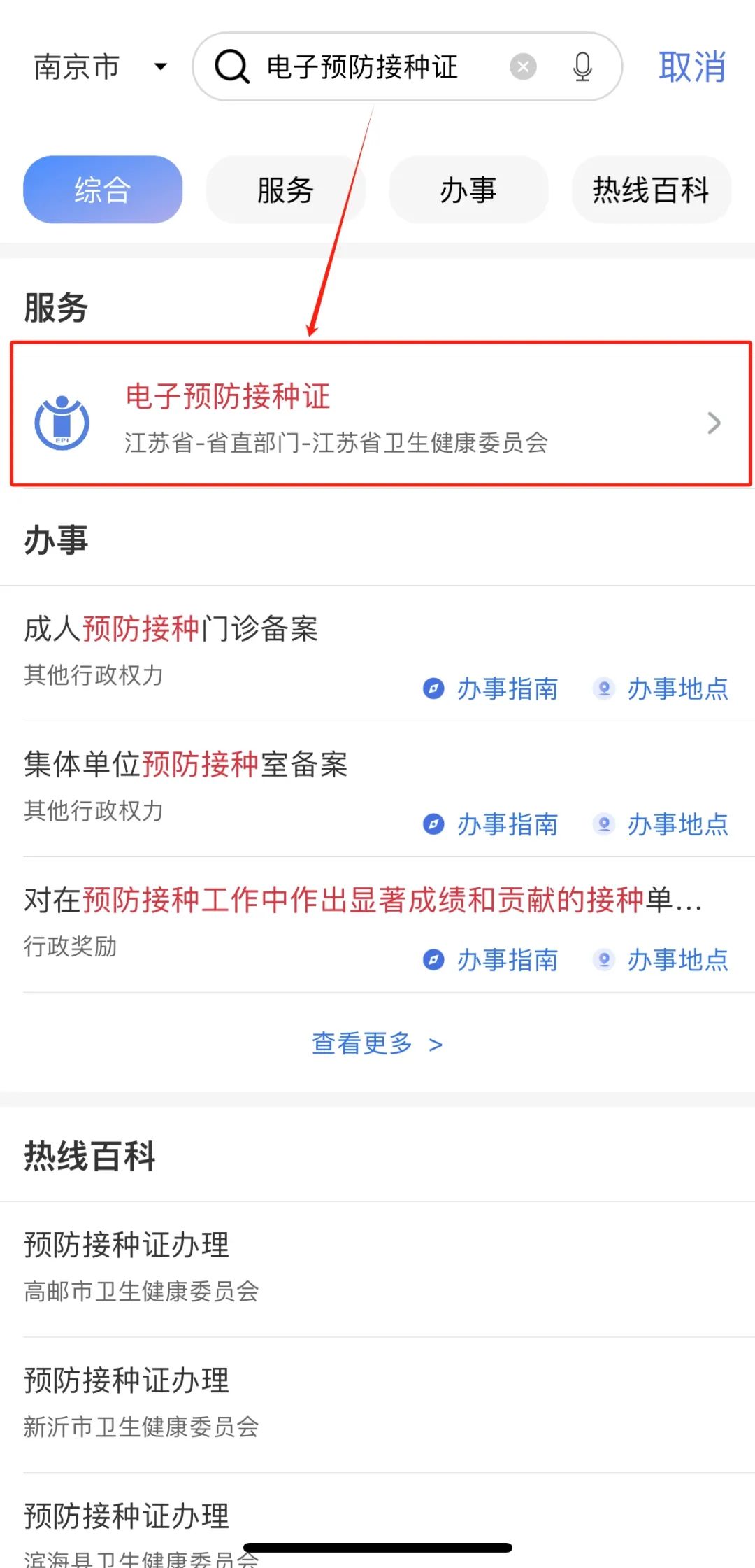 在支付宝首页搜索“苏服办”,进入小程序,在首页搜索“电子预防接种证”,进入服务。