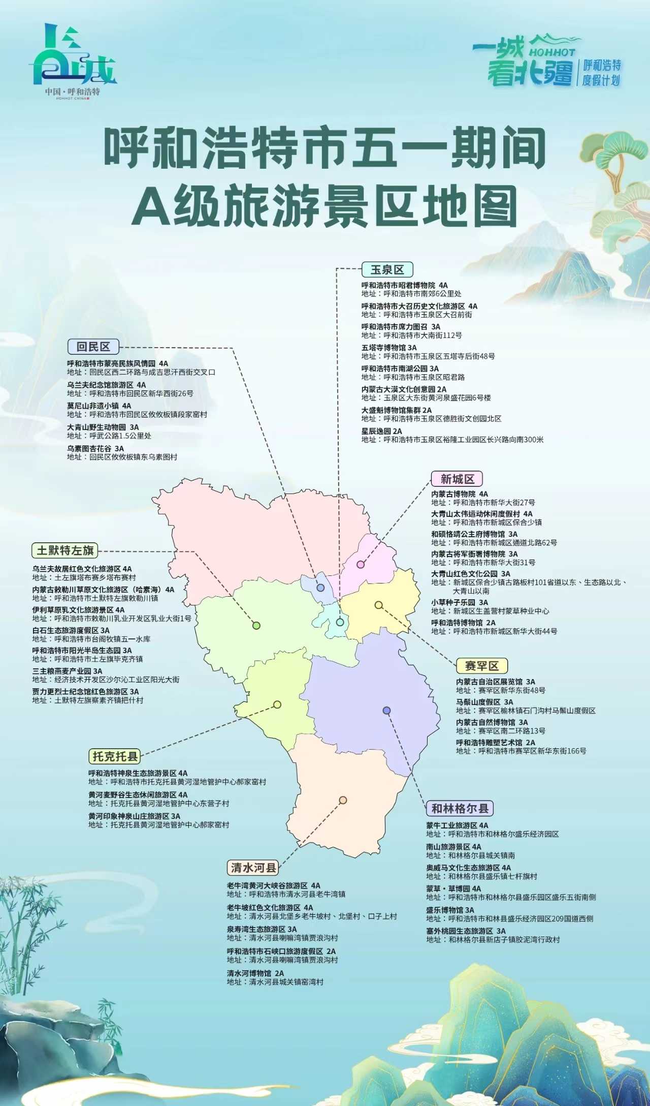 为迎接即将到来的“五一”假期,市文化旅游广电局统筹全市旅游资源,制作并发布五一呼和浩特旅游指南,包含节日期间全市A级景区开放地图,为广大市民游客选择出游地提供便利。