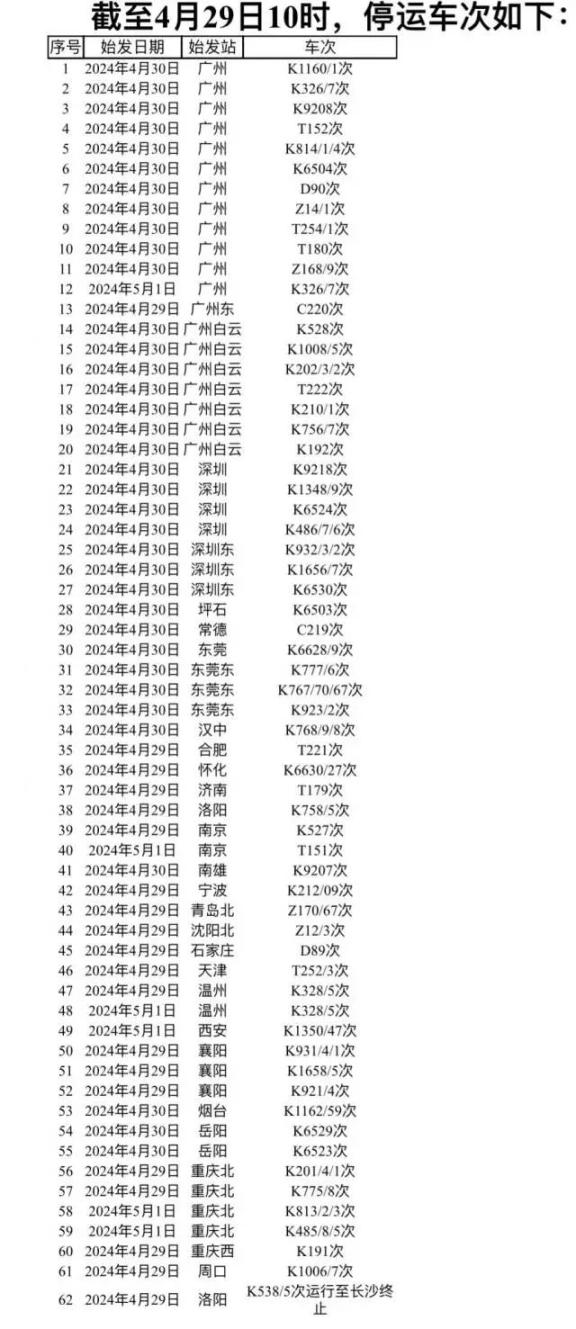据广铁集团4月29日12时通报,根据气象部门消息,近期湖南大部、广东中北部将出现较大范围的大到暴雨,将对铁路运输秩序造成一定的不利影响。广铁集团始终坚持“人民至上、生命至上”原则,以确保列车和旅客的安全为出发点,根据降雨影响范围,精准研判,主动避险,于4月29日至5月1日期间计划停运京广铁路普速列车62列,京广、京九普铁和京广高铁的部分列车将出现不同程度晚点。