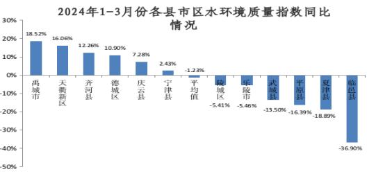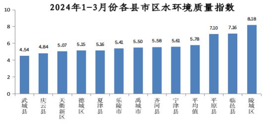 2024年1-3月份,12个县市区水质指数平均值为5.78,其中较好的是武城县(4.54)、庆云县(4.84)、天衢新区(5.07);较差的是陵城区(8.18)、临邑县(7.16)、平原县(7.10)。与去年同期相比,6个县市区改善,改善幅度较大的是禹城市(18.52%)、天衢新区(16.06%)、齐河县(12.26%);6个县市区恶化,同比恶化幅度较大的是临邑县(-36.90%)、夏津县(-18.89%)、平原县(-16.39%)。