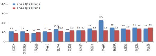 2024年3月份,全市二氧化硫平均浓度为11.7微克/立方米。与去年同期相比,改善12.0%。全市二氧化硫浓度较好的是齐河县、天衢新区,为9微克/立方米;最差的是武城县,为15微克/立方米。12个县市区中,8个县市区同比改善,1个县市区同比持平,3个县市区同比恶化,其中,同比改善幅度最大的是夏津县,改善47.8%;同比恶化幅度最大的是陵城区,恶化20.0%。