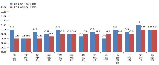 2024年3月份,全市一氧化碳平均浓度为0.8毫克/立方米。与去年同期相比,改善11.1%。全市一氧化碳浓度较好的是齐河县、夏津县、庆云县,为0.6毫克/立方米;较差的是乐陵市、宁津县,为1.0毫克/立方米。12个县市区中,7个同比改善,3个同比持平,2个同比恶化,其中,同比改善幅度最大的是庆云县,改善40.0%;同比恶化幅度最大的是禹城市,恶化33.3%。