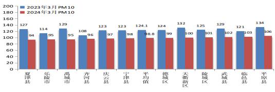 2024年3月份,全市可吸入颗粒物平均浓度为98.8微克/立方米。与去年同期相比,改善20.4%。全市可吸入颗粒物浓度最好的是夏津县,为94微克/立方米;最差的是平原县,为106微克/立方米。12个县市区均同比改善,其中,同比改善幅度最大的是禹城市,改善26.4%。