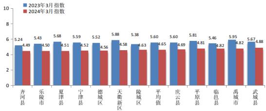 2024年3月份,全市各县市区综合指数均值为4.65。与去年同期相比,改善17.0%。全市综合指数较好的是齐河县(4.49)、乐陵市(4.50)、夏津县(4.51);较差的是武城县(4.88)、禹城市(4.82)、临邑县(4.82)。12个县市区均同比改善,其中,同比改善幅度较大的是天衢新区(22.1%)、夏津县(20.6%)、宁津县(19.1%)。