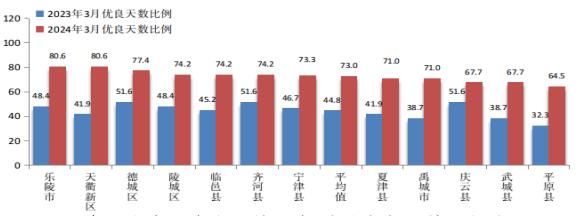 2024年3月份,全市环境空气质量优良天数比例为73.0%。与去年同期相比,改善62.9%。全市优良天数比例较好的是乐陵市(80.6%)、天衢新区(80.6%)、德城区(77.4%);较差的是平原县(64.5%)、武城县(67.7%)、庆云县(67.7%)。12个县市区均同比改善,其中,同比改善幅度最大的是平原县,改善99.7%。