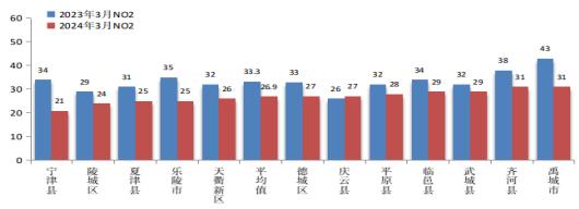 2024年3月份,全市二氧化氮平均浓度为26.9微克/立方米。与去年同期相比,改善19.2%。全市二氧化氮浓度最好的是宁津县,为21微克/立方米;最差的是禹城市,为31微克/立方米。12个县市区中,11个县市区同比改善,1个县市区同比恶化,其中,同比改善幅度最大的是宁津县,改善38.2%;同比恶化的是庆云县,恶化3.8%。