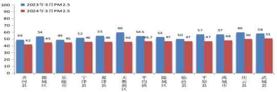 2024年3月份,全市细颗粒物平均浓度为46.7微克/立方米。与去年同期相比,改善14.3%。全市细颗粒物浓度最好的是齐河县,为42微克/立方米;最差的是武城县,为51微克/立方米。12个县市区均同比改善,其中,同比改善幅度最大的是天衢新区,改善23.3%。