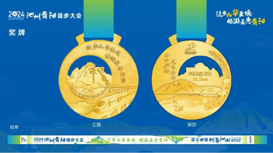奖牌整体围绕赛事主题呈异形镂空设计。奖牌正面以高铁动车与著名风景区九华山作为主要元素,镂空处天台高耸云端,徒步者行走在圣境之中,充分彰显了青阳独特的风景与魅力。奖牌背面以青阳县特产黄精和芙蓉湖为主要元素,芙蓉湖水面清澈。充分诠释了赛事主题:徒步九华圣境,畅游灵秀青阳。