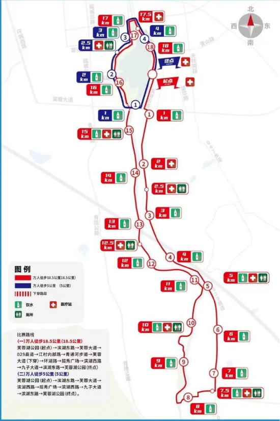 徒步起点位于芙蓉湖广场,万人徒步5公里项目赛道途径芙蓉湖一圈,徒步爱好者们可以深度感受芙蓉湖的自然风光和文化特色。