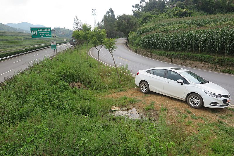 山顶之后,一路下坡,大约10公里之后,进入坝子,此时国道旁边出现高速公路,高速路上的牌子,写着孔家庄隧道,它所穿过的,就是我刚刚翻过的那座山。