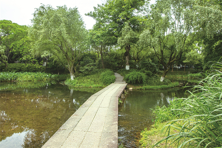 这个季节,沿着赵公堤漫步,一路上都是幽幽小径,溪水潺潺,满眼绿意。快靠近杨公堤这头时,会看到一座别致的小桥——毓秀桥。