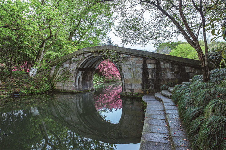 这座桥并不是西湖景观中以前就有的古桥,它原在萧山区新塘街道涝湖村,清道光九年(1829年)里人陈有尚出资修建。为单孔石拱桥,造型优美,东侧桥眉石镌刻“毓秀”二字,桥心石刻八卦图案。2003年按原貌迁移保护至赵公堤。最近这段时间,桥边艳丽夺目的红花檵木开得正盛,古桥、红花相映成趣,拍照的话非常出片。