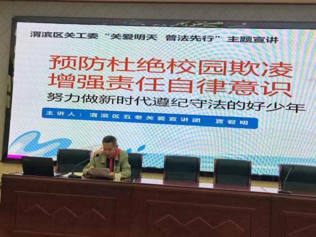 为进一步贯彻落实“八五”普法规划,持续推进第三十个法治宣传月“法律九进”校园普法宣传教育,提高学生预防侵害和自我保护能力,近日,渭滨区司法局金陵司法所联合渭滨区关工委在金陵小学举办“关爱明天 普法先行”反校园欺凌专题法治报告会,邀请渭滨区“五老关爱宣讲团”成员夏君明老师担任主讲嘉宾,渭滨区司法局副局长刘建荣、渭滨区关工委主任卢婷出席法治报告会。