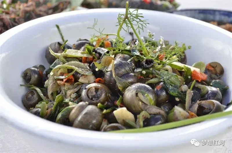 绿春是一个很适合慢生活的小城,建梯田种稻谷、上山采野菜、下河摸鱼虾,这里形成了独特的饮食文化,梯田里除了有梯田红米之外,还有梯田鱼、田螺、虾巴虫、泥鳅、黄鳝等一些新鲜的水产品,都是营养又美味的特色美食。