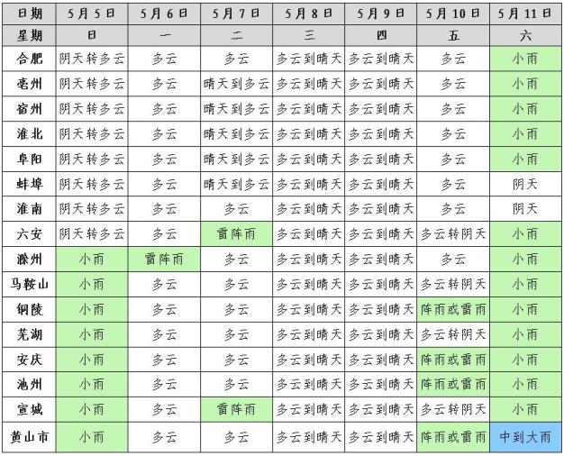 安徽气象预计,未来三天安徽省部分地区有阵雨或雷雨天气;10日起安徽省有降水过程,其中11日沿江江南部分地区中到大雨;其他时段全省以多云到晴天气为主。