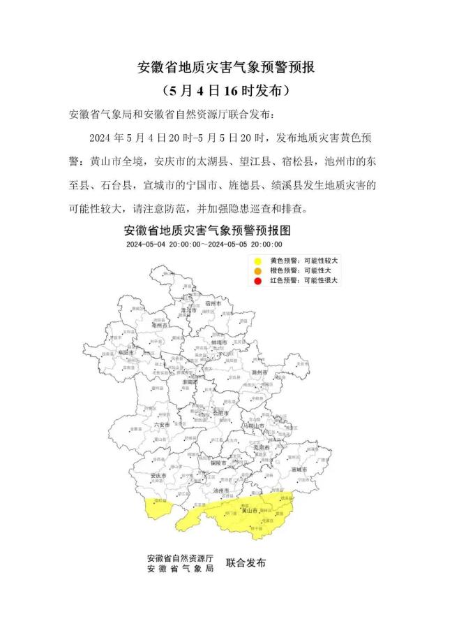 2024年5月4日20时-5月5日20时,发布地质灾害黄色预警:黄山市全境,安庆市的太湖县、望江县、宿松县,池州市的东至县、石台县,宣城市的宁国市、旌德县、绩溪县发生地质灾害的可能性较大,请注意防范,并加强隐患巡查和排查。