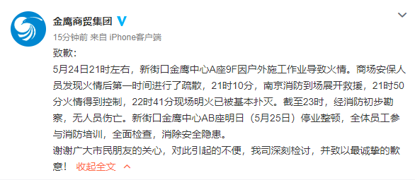 南京新街口金鹰失火:无人员伤亡 金鹰商贸集团发布致歉信