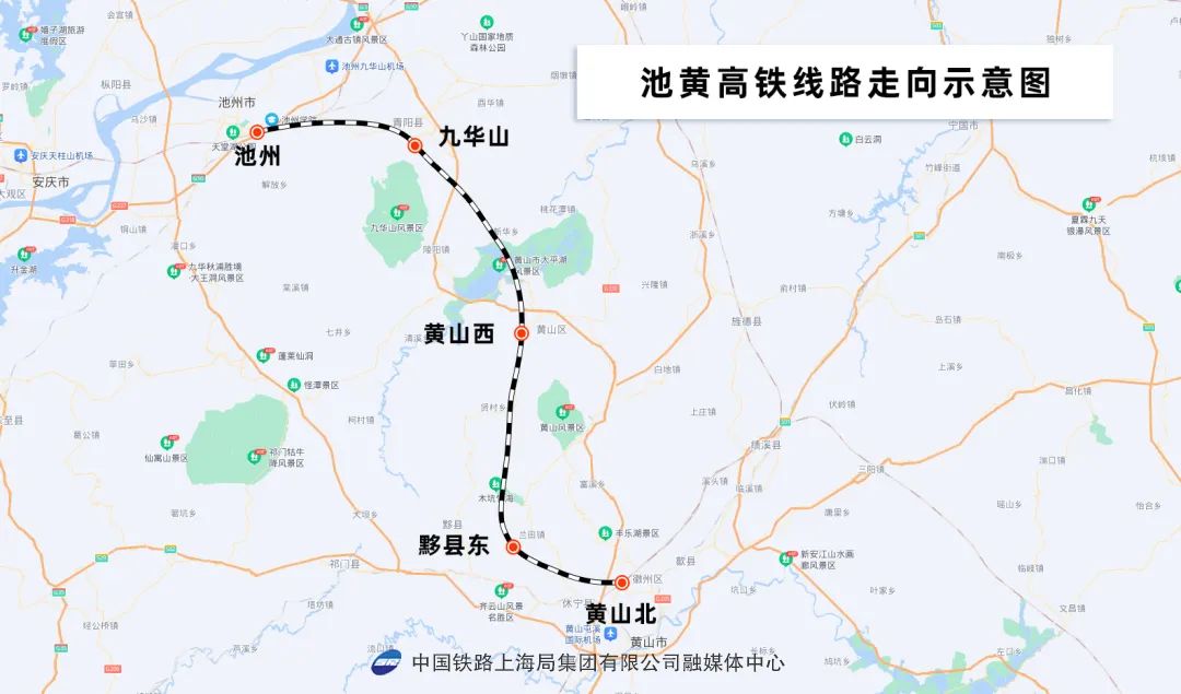 池黄高铁是武汉至杭州高速铁路通道的重要组成部分,线路从池州站至黄山北站,新建正线长约125公里,设计时速350公里。全线设池州、九华山、黄山西、黟县东、黄山北等5座车站。项目建成通车后,将成为串联皖南两山一湖(九华山、黄山、太平湖)核心景点的黄金旅游线路,对于完善区域铁路网布局、加快皖南国际文化旅游示范区建设、促进沿线经济社会协调发展等具有重要意义。