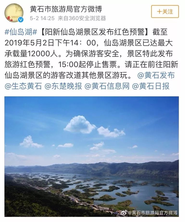 截至5月2日下午2时,仙岛湖景区已达最大承载量12000人。为确保游客安全,景区特此发布旅游红色预警,15:00起停止售票。请正在前往阳新仙岛湖景区的游客改道其他景区游玩。