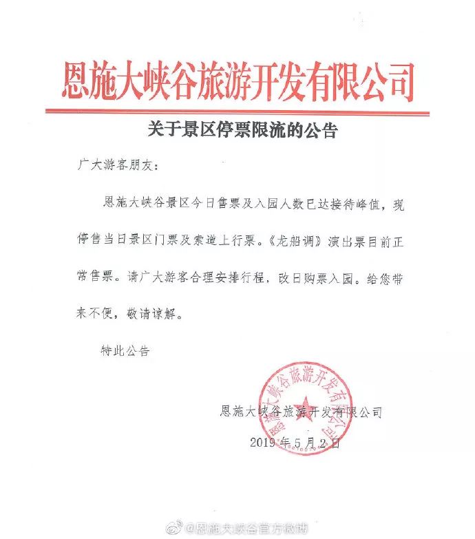 5月2日上午8时半,恩施大峡谷景区发布温馨提示,提醒游客“景区已接近承载量峰值,即将停止售票”。