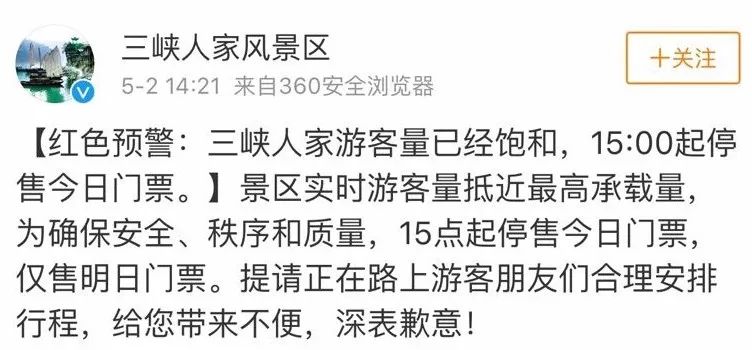 5月2日,景区实时游客量抵近最高承载量,为确保安全、秩序和质量,15点起停售今日门票,仅售明日门票。提请正在路上游客朋友们合理安排行程。