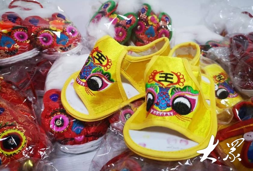 一进产业园销售展示间,映入记者眼帘的,是琳琅满目、造型各异的虎头鞋、虎头帽以及各种花鸟鱼虫图案的刺绣,一个巨大的老虎造型的刺绣前,引来不少人驻足拍照。