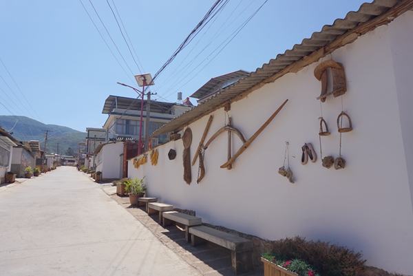 淳朴自然、干净整洁,是每个走进哪吐村委会上元乐村民小组的人收获的第一印象。这个只有50多户村民的小村子,90%以上是傈僳族,22户是共产党员户,家家户户门口贴着“门前三包”的承诺书,房前屋后统一的木栅栏围种着鲜花绿植,公共道路两旁的墙上还有草鞋、犁耙等老生产物件陈列。