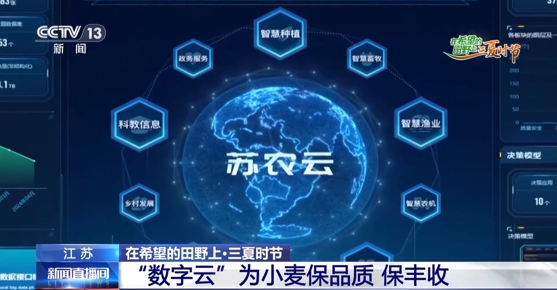 三夏大忙时节,记者来到了江苏省农业农村大数据指挥中心,这里相当于江苏全省“三农”工作的智慧大脑。眼下全省的3600万亩小麦正在抓紧收获,麦田之上,有十朵“数字云”正在为全省的农民,提供精准的科技服务。