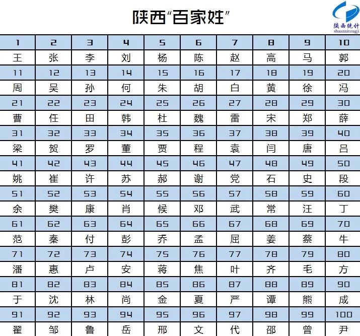 陕西省第七次全国人口普查结果显示,全省常住人口约有5050个姓氏,其中排名前一百的“百家姓”约有3375万人,占全省常住人口的85.38%。