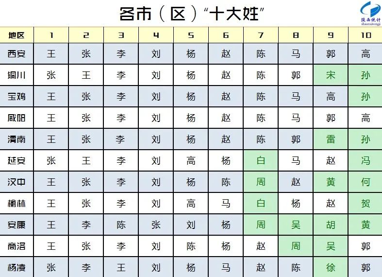 从各市(区)来看,除西安之外,一些新的姓氏也进入了各市(区)的前十榜位。例如,渭南的“雷”“孙”,延安的“白”“冯”,汉中的“周”“黄”“何”等。