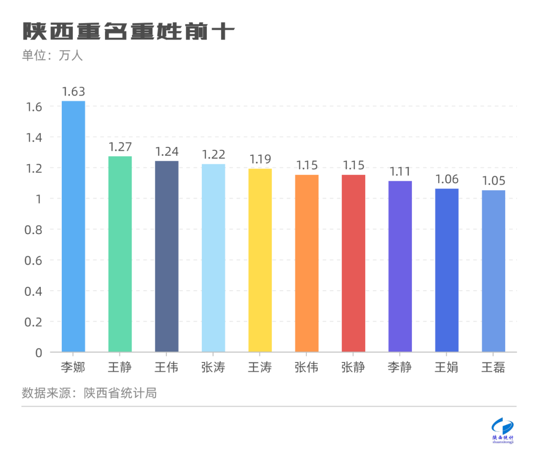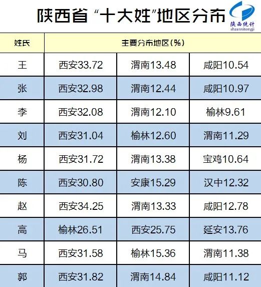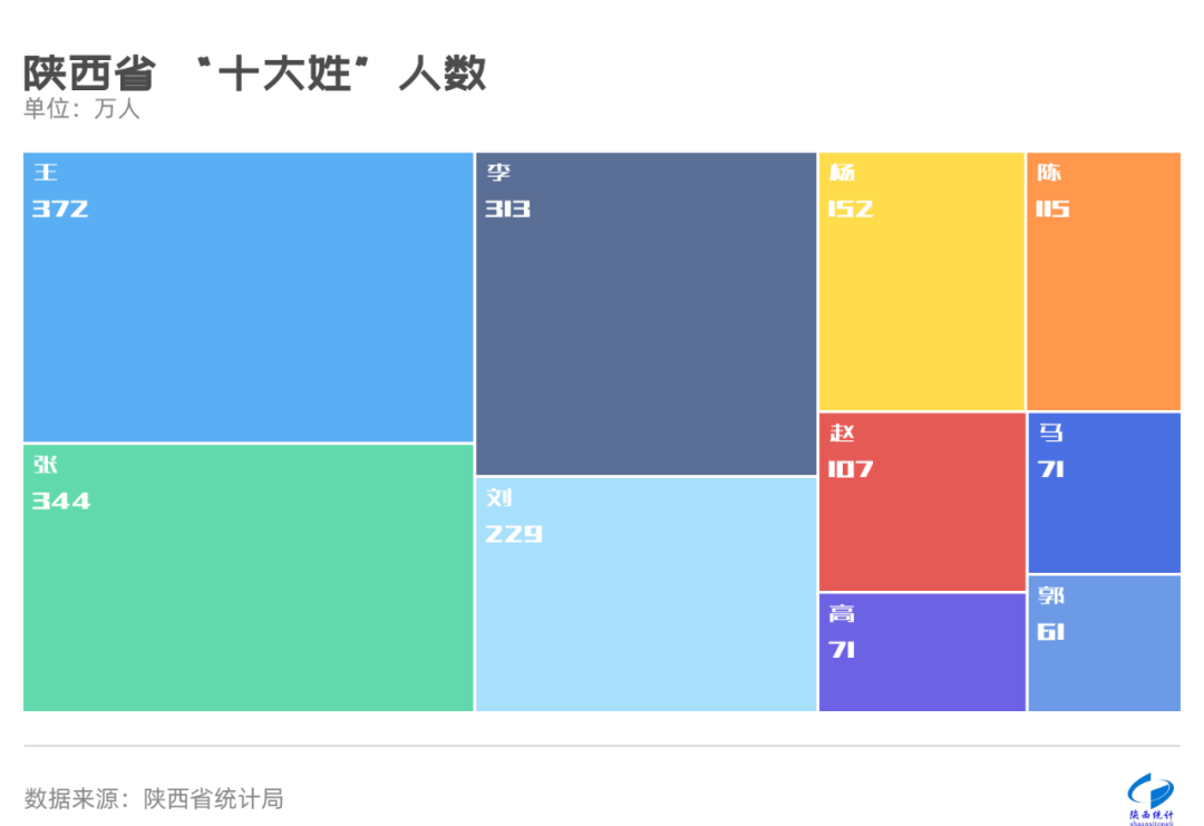 全省排名前十的“大姓”约有1835万人,占全省常住人口的46.42%,由高到低依次为:“王”“张”“李”“刘”“杨”“陈”“赵”“高”“马”“郭”。其中排名第一的陕西“大姓”是“王”姓,约有372万人,占全省常住人口的9.41%。